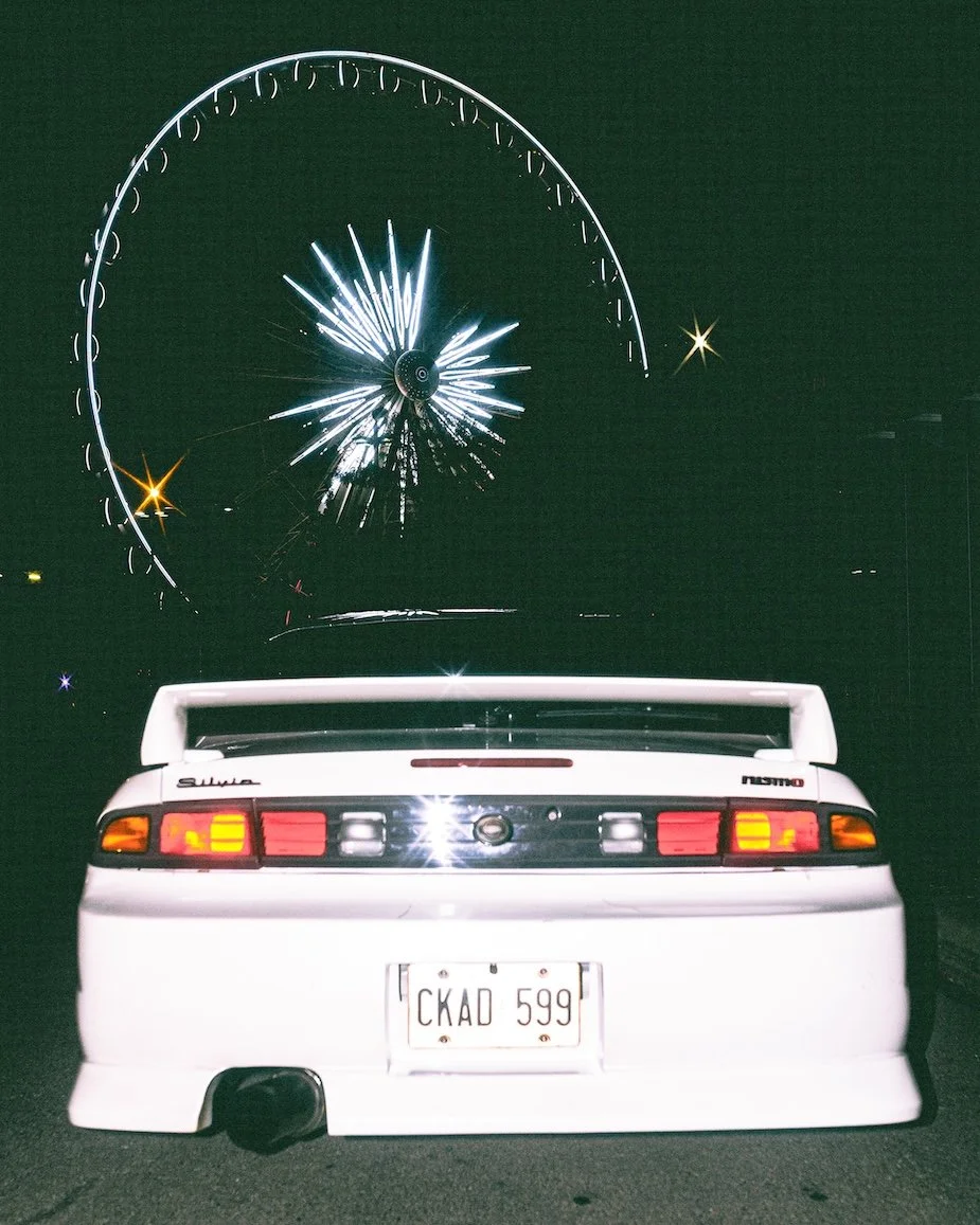 Rear view of a white S14 parked at night with a Ferris wheel and fireworks in the background.