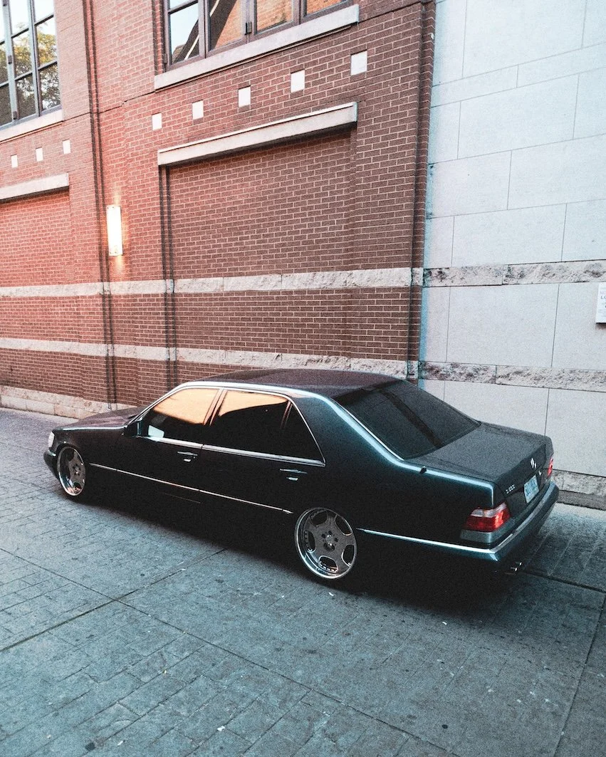 A silver vintage Mercedes-Benz sedan with tinted windows parked on a city sidewalk next to a brick building.