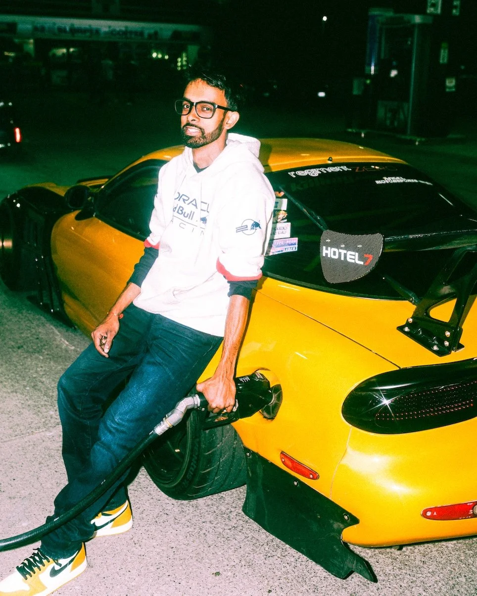 A man in a white hoodie with logos, glasses, and yellow sneakers standing next to a yellow Mazda RX-7 at night. The car has a prominent rear wing and a large fueling nozzle in the man's hand.